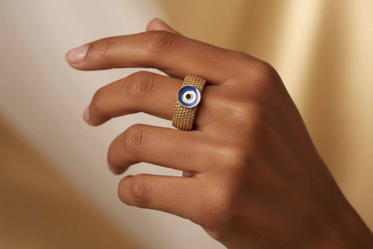 انگشتر بافت چشم طلا با طراحی خاص و چشم‌نظری میناکاری‌شده در مرکز، ترکیبی از زیبایی و نمادگرایی است. این انگشتر از طلای خالص ساخته شده و با جزئیات بافتی زیبا و چشم‌نظری که نماد حفاظت و خوش‌شانسی است، جلوه‌ای خاص به دستان شما می‌بخشد. میناکاری دقیق در مرکز، آن را به جواهری منحصربه‌فرد تبدیل کرده است. مناسب برای استایل‌های روزمره یا رسمی، این انگشتر هم زیبایی و هم معنا را به همراه دارد.